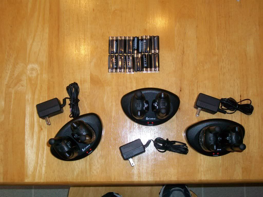These are never-used (tested to ensure function) radios that come in packs of two with 4 rechargable AAA batteries per radio (charges using radio base). Has all the standard radio features, can use channels 1-22, and can use a single-pin headset/mic.